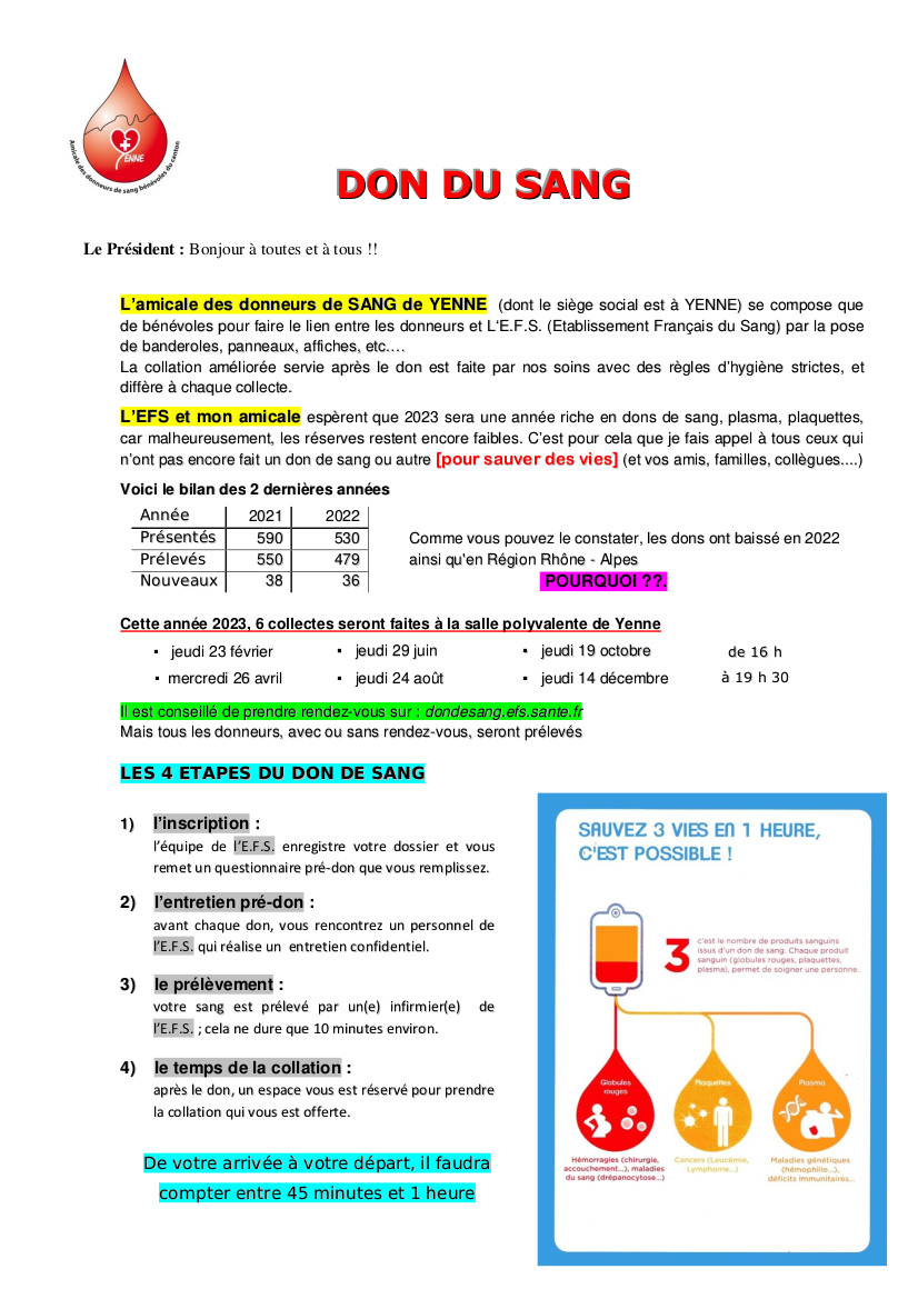 L’amicale des donneurs de SANG de YENNE (dont le siège social est à YENNE) ne se compose que de bénévoles pour faire le lien entre les donneurs et L‘E.F.S. (Etablissement Français du Sang) par la pose de banderoles, panneaux, affiches, etc....